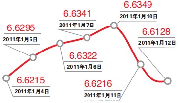 2011年1月12日银行间外汇市场人民币汇率中间价为:1美元对人民币6.6128元,1欧元对人民币8.5851元,100日元对人民币7.9390元,1港元对人民币0.85040元, 1英镑对人民币10.3193元,人民币1元对0.46319林吉特,人民币1元对4.6126俄罗斯卢布。