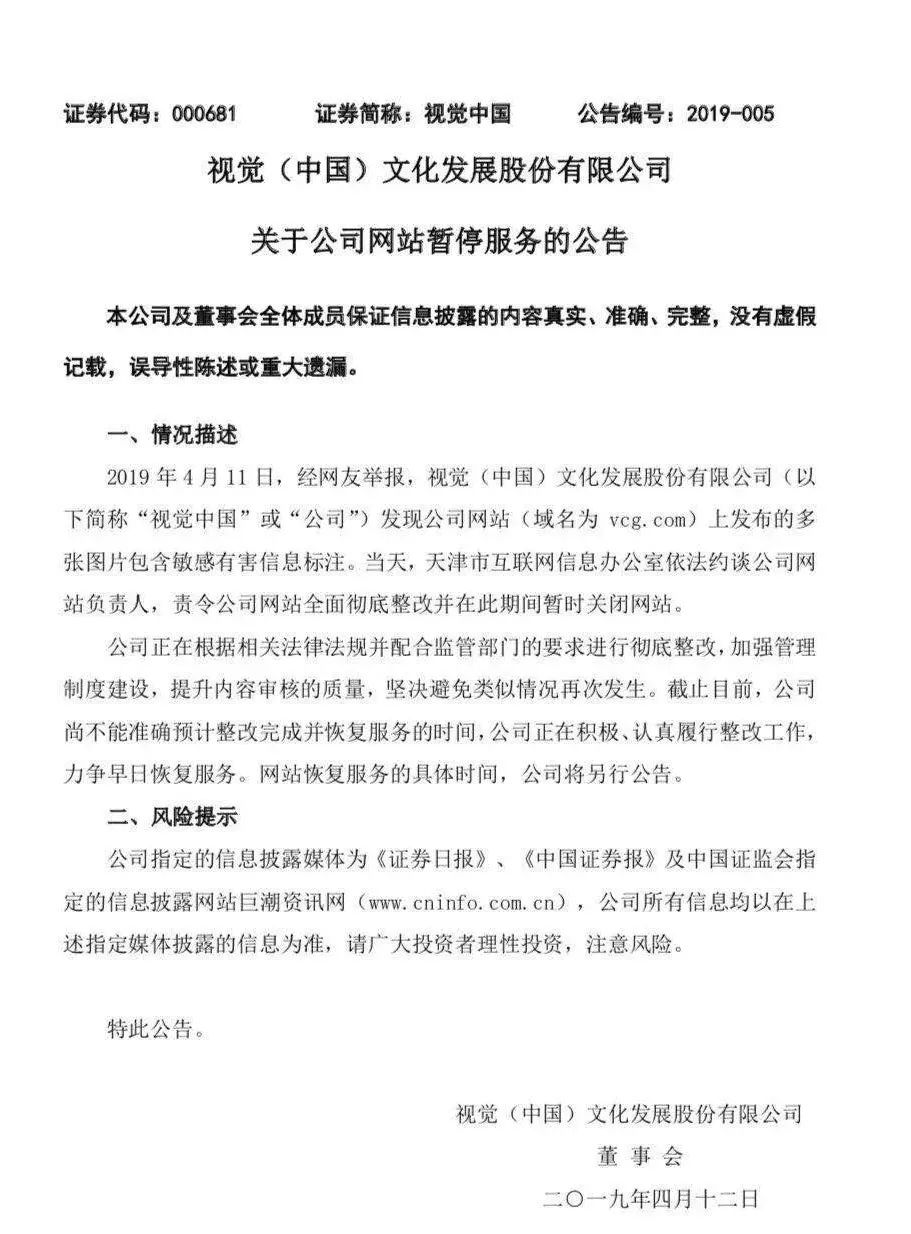 没想到的是,监管迅速反应。11日晚间,天津市网信办连夜约谈视觉中国并责令视觉中国网站立即停止传输相关信息,采取措施消除恶劣影响。今日凌晨,视觉中国在微博发布道歉声明,表示已采取措施对不合规图片下线处理,并关闭网站开展整改。