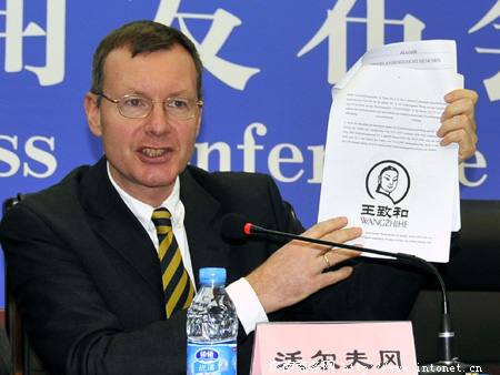 3月29日,德国律师沃尔夫冈博士展示德国欧凯公司恶意抢注的王致和商标。